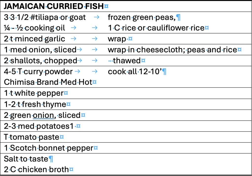 JAMAICAN CURRIED FISH 3 3 1/2 #tiliapa or goat frozen green peas,¼ – ½ cooking oil 1 C rice or cauliflower rice 2 t minced garlic 1 med onion, sliced wrap in cheesecloth; peas and rice shallots, chopped thawed 4-5 T curry powder cook all 12-10’ Chimisa Brand Med Hot 1 t white pepper1 2 t fresh thyme 2 green onion, sliced 2-3 med potatoes 1 T tomato paste 1 Scotch bonnet pepper Salt to taste 2 C chicken broth