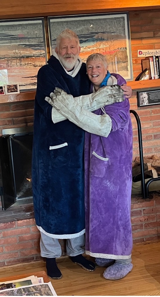 We called Gary, our builder, to involve him in the restoration. He was aghast at the pictures we showed him and got worried the fire might have affected the nearby metal spiral staircase. He came, inspected, and proceeded to put it back together like nothing happened. Our house and its contents got a thorough cleaning. We had to replace the gloves and the table. At the time, Kathy was working on a masters in geology. The head tech of the lab in which she was working heard the story and gave her a pair of long asbestos gloves. And the table? We found a metal one about the same size as the vaporized one. It’s working out fine. Entering our second fire-free decade.