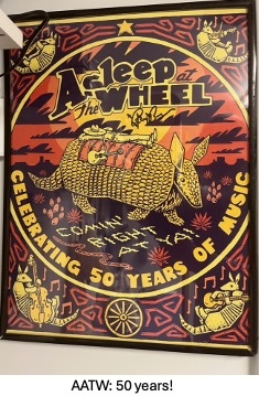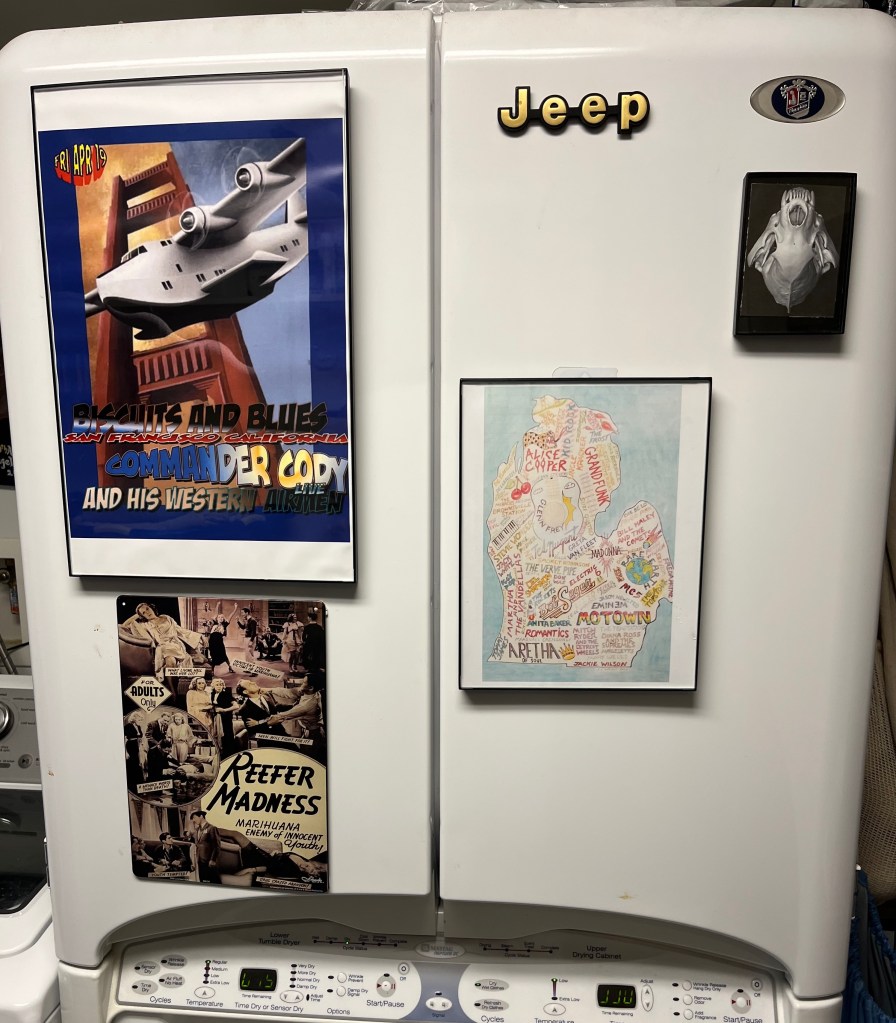 The original mancave decorations left a bare white face to the hanging-up portion of my dryer. No more. As you look at the front, starting a 7 PM and moving clockwise, there’s a movie poster for “Reefer Madness”, a popular movie among us stoners back in the early 70s. Above that is one of my many Commander Cody posters. The late George Frayne IV (a.k.a. the Commander) was an accomplished painter and sculptor and did all of his own posters after his brother died. That Jeep logo is off my first Jeep, a ’91 Cherokee Limited, which gave 20 years of great service before rusting out. I found in Facebook that cartoon of Michigan’s mitten filled with the names of famous rockers from our state and managed to capture it to print out. The wolverine skull you’ve seen before.