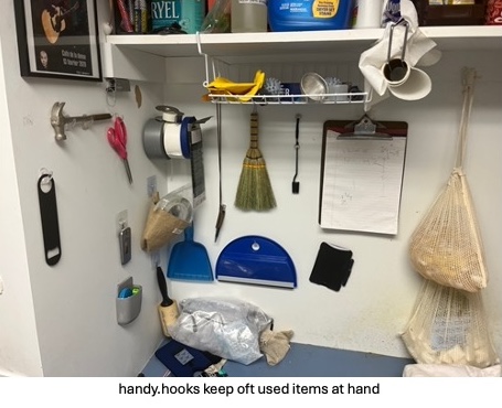 That lintel over the washer and dryer had been bare. Now see it ordained with two bicycle helmets framing 7 post cards featuring labels from fruit and vegetable crates. Then there’s a card featuring Dick Cheney to the right of the deep blue helmet. And underneath all that is my Commander Cody corner and decorations for the dryer.