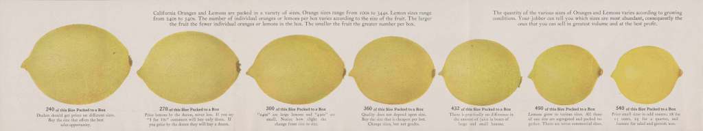 Calls for “juice of one lemon” don’t always denote size of lemon or volume of juice yielded. Lemons are characterized by a 3digit number, which denotes the number of lemons that size that fit into a shipping case: 240 to 540. Michigan State has produced a nice guide, which includes this illustration (20 (). The small print may be hard to read, but range of sizes is clear.