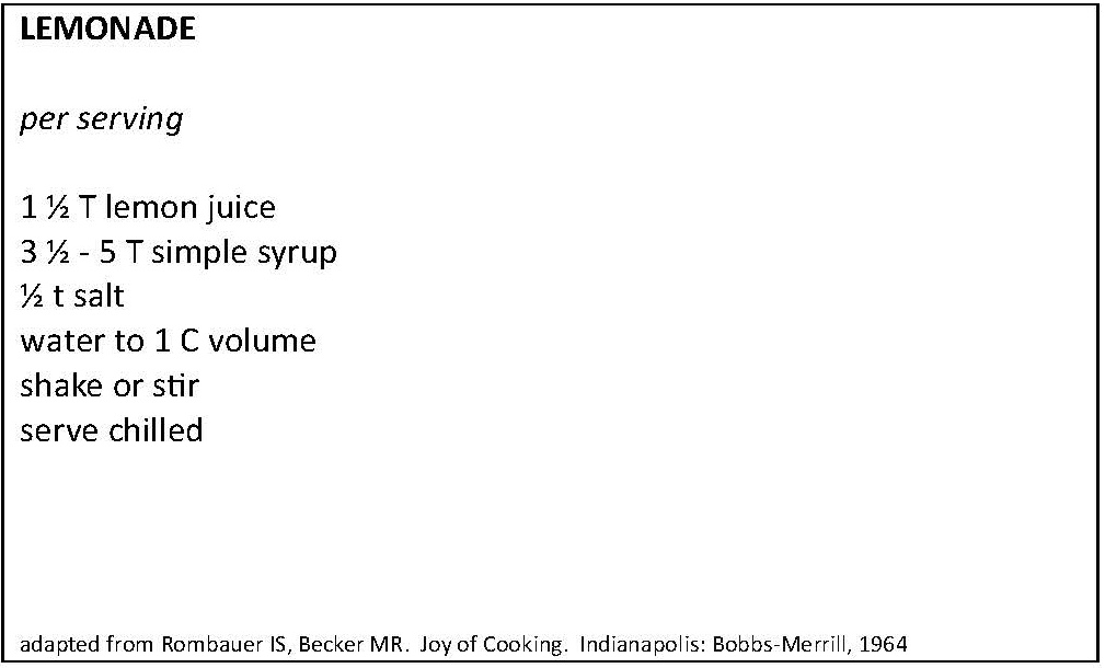 Dr. Google tells me from several sources that an “average lemon” yields 2-3 tablespoons of juice. If you’re fond of metric, here’s a nice thorough reference (21). In it, the author reminds you can increase the juice yield by gently rolling and/or briefly microwaving each fruit before squeezing. I’ve stuck with actual volumes of juice in my recipes. I got 135 ml of juice from my 2 larger lemons, which together weighed 14.3 ounces (450 gm). I juiced half my 8-bag of smaller lemons – which weighed 12.8 oz (363 gm) – and got 205 ml. So, on a juice/lemon weight, I got a better yield from the smaller ones, this time. So, with 45 ml/8 oz cup of lemonade, I’ve got enough for 7 ½ glasses. Note that the lemonade syrup uses some rind, so not all that precious zest flavor goes to waste. But do you really need to do all that squeezing when there’s ReaLemon? While bottled juices have most of that lemon flavor, they just don’t have the zest of fresh-squeezed (22). The author of that article reminds that leftover lemon juice can be frozen in ice cube trays for later use.