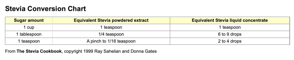 The stevia is a little more complicated, as it is so potent. You never use much, and I recommend you titrate up. The nice folks who make Stevia Have provided a helpful conversion chart (17).
