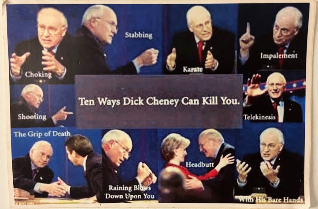 Before we leave the lintel, let’s not forget ol’ Darth Vader. While Cheney had his faults, he could be entertaining if you were on his side. The creator of this card takes all those fears of Cheney’s ruthlessness and distills them into a few vignettes.